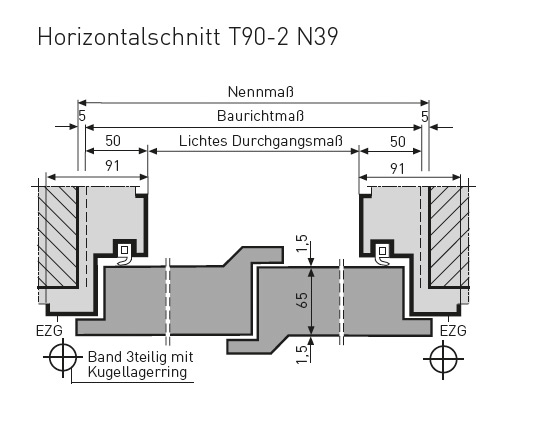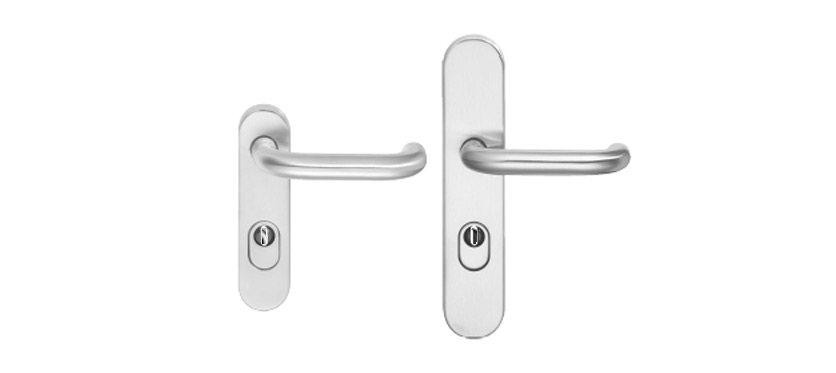 2 hinge plates, three-dimensionally adjustable (standard 3-D hinge), with hinge lock, aluminium knob-lever set as per DIN 18257 ES 1 ZA with 72 mm short plate and SI profile cylinder as per DIN 18252 BS (35 + 26 mm), safety card and three keys.