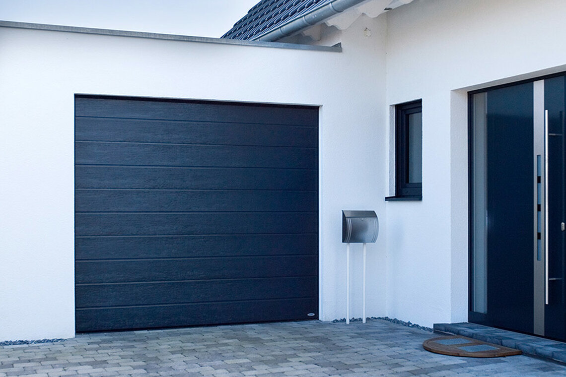 Las puertas de garaje seccionales Novoferm están dotadas de un pie de marco de acero galvanizado resistente a la intemperie. Esto facilita la evacuación del agua, evitando la oxidación del marco con el tiempo. La construcción graduada es especialmente apropiada para renovaciones, para sustituir una puerta basculante con carril inferior por una puerta de garaje seccional.