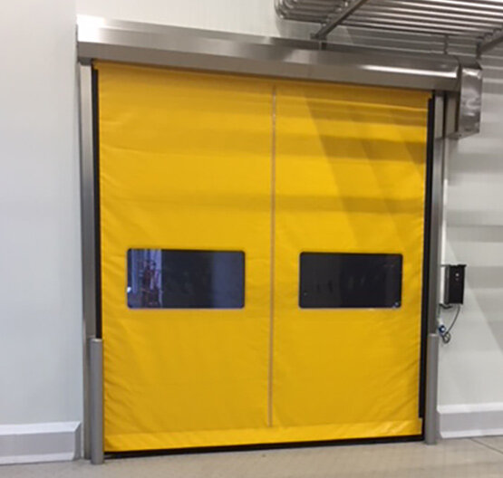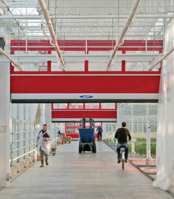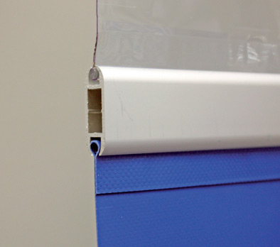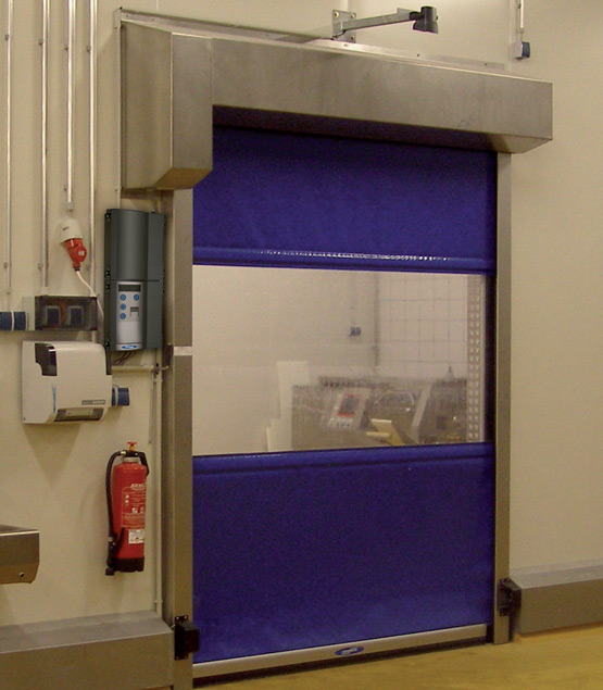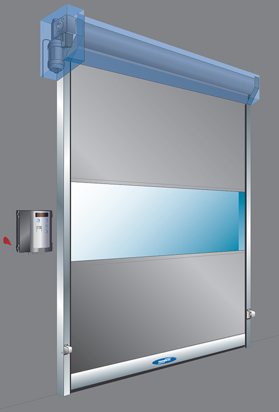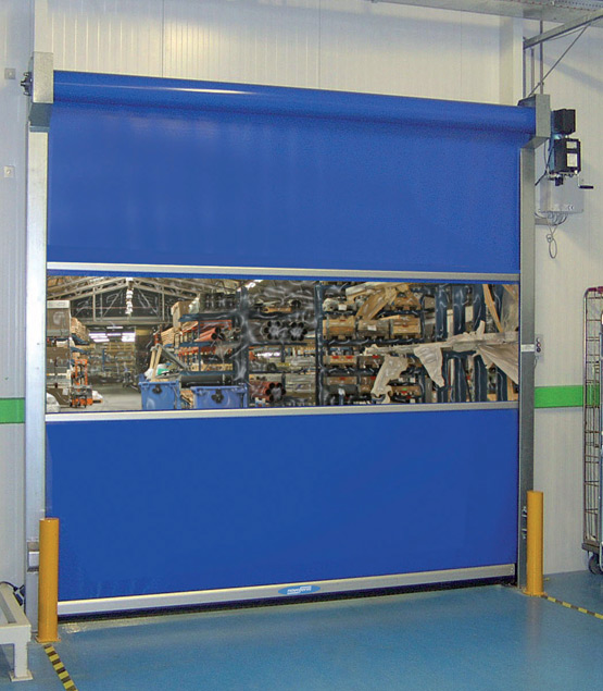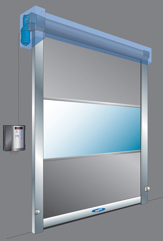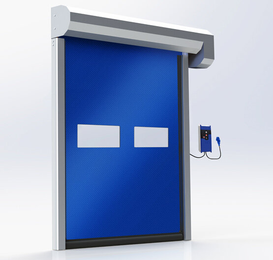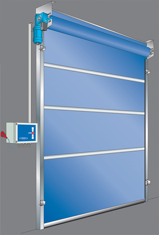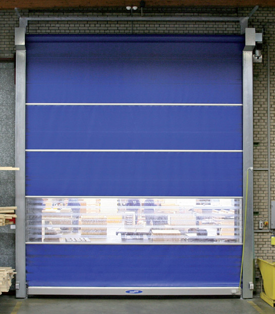 La lona de la puerta está disponible en 9 colores. La cortina de la puerta está provista de ventanas transparentes (opción). Las guías de acero y la cubierta superior tienen un recubrimiento de pintura blanco (RAL-9016) o gris (RAL-7011) como estándar, pero también se puede elegir el color RAL como opción. 1