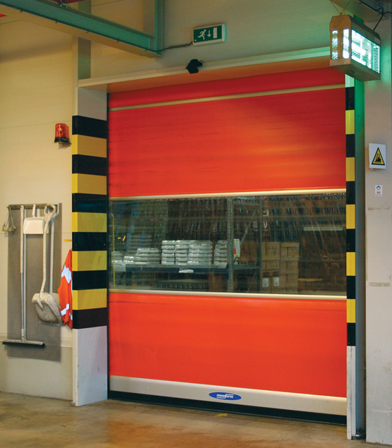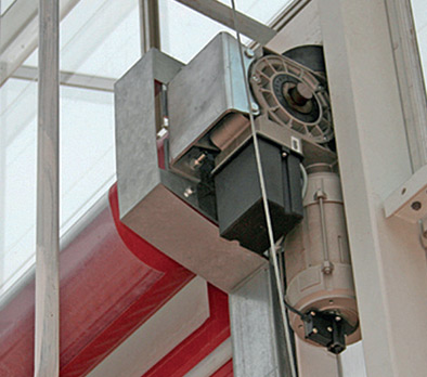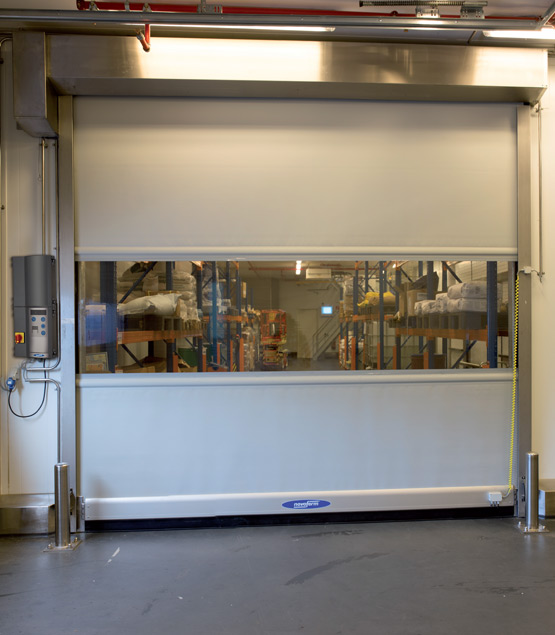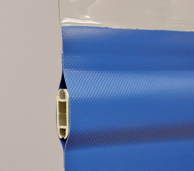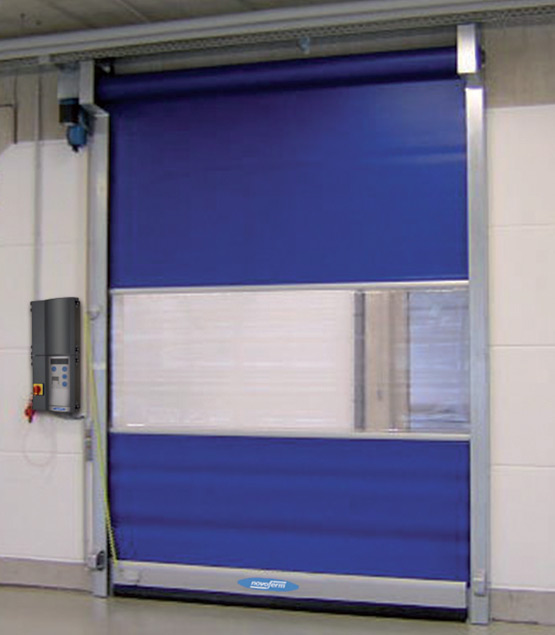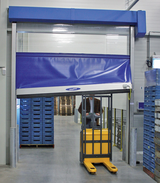 El NovoZip tiene una lona de 900 g/m2, clase M2, hecha de un material sintético reforzado con poliéster, con un perfil sellado de goma flexible en la parte inferior. Las columnas de acero con un cierre de cremallera aseguran la guía de la cortina de la puerta. Estas forman una unidad tensa con los soportes superiores para la fijación del rodillo y el forro protector..